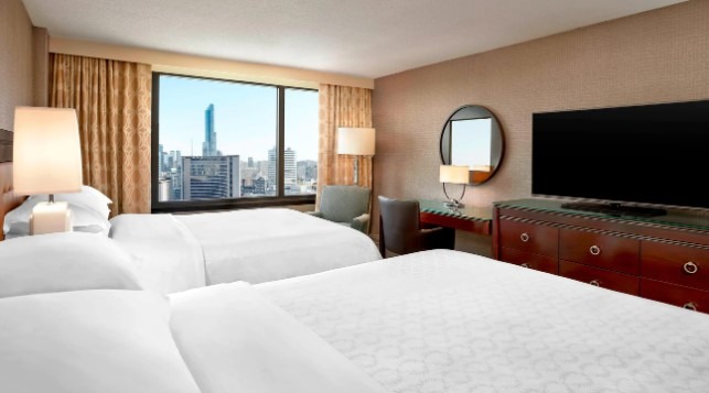 A traditional guestroom with two Queen Sheraton Signature Beds. Sheraton Signature Beds have plush mattresses, luxe white linens and cozy duvets. This room includes a 55" LCD Flat screen television, modern work desks and a mini-fridge.