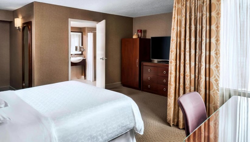 A traditional guestroom with one King or one Queen Sheraton Signature Bed. Sheraton Signature Beds have plush mattresses, luxe white linens and cozy duvets. This room includes a 55" LCD Flat screen television, a modern work desk and a mini-fridge.